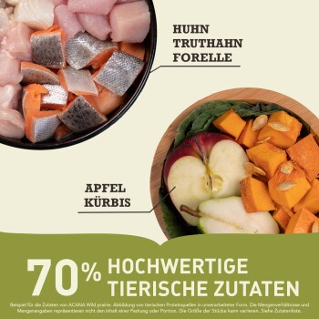 Hunde aller Rassen sind Fleischfresser. Sie sind dafür geschaffen, eine vielfältige und abwechslungsreiche Nahrung aus viel frischem Fleisch und weniger Obst und Gemüse sowie Heilpflanzen zu sich zu nehmen. Das Acana Wild Prairie liefert viel frisches Fleisch vom Freiland Huhn & Truthahn sowie frische ganze Eier von den Farmen rund um die Herstellungsstätte im kanadischen Alberta. Zudem kommen wild gefangener Fisch wie frischer Zander und Forelle aus den unberührten Seen Kanadas sowie Obst und Gemüse aus dem sonnigen Okanagan-Tal British Columbias dazu. Acana wird ausschließlich in eigenen Kanadischen NorthStar Küchen hergestellt, mit frischen Zutaten aus nachhaltiger Gewinnung. Das Futter verfügt über eine unübertroffene Vielfalt an regionalen Zutaten, welche für den menschlichen Verzehr zugelassen sind. Alle Zutaten werden von regionalen Farmen Albertas täglich frisch angeliefert. Es bietet einen hohen Anteil an Fleisch (70%) und Protein (35%), begrenzte Kohlenhydrate (25%) und ist vollkommen getreidefrei. Auch wenn sie unterschiedlich aussehen, Ihr Hund teilt seine Anatomie mit dem grauen Wolf, was bedeutet, dass er als Fleischfresser geboren wurde und an eine Ernährung mit viel Fleisch, Eiweiß und Fett angepasst ist. Auf der Grundlage dieser biologischen Tatsache und einer Ernährungsanalyse, welche die natürliche Ernährung von Hunden widerspiegelt, verfügt Acana über nahrhafteste Proteine und Fette und reduziert unerwünschte Kohlenhydrate. Das Futter ist erhältlich folgenden Verpackungsgrößen: 2kg, 6kg, 11,4kg, 2x11,4kg.