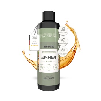 DER IDEALE BEGLEITER: BARF ÖL FÜR KATZEN Du möchtest Deiner Katze nur das Beste bieten und achtest auf eine natürliche, artgerechte Ernährung? Mit dem alphazoo Alpha Barf Öl für Katzen bereicherst Du die täglichen Mahlzeiten Deiner Samtpfote auf schmackhafte und gesunde Weise. Perfekt abgestimmt, unterstützt dieses Öl eine ausgewogene Barf-Ernährung – ganz ohne künstliche Zusätze. BALANCE PUR: OMEGA 3 6 9 FÜR KATZEN Harmonie im Napf – dafür steht das alphazoo Omega 3 6 9 Öl für Katzen. Dieses hochwertige Öl ist eine wertvolle Quelle für essentielle Fettsäuren, die zur Unterstützung eines gesunden Stoffwechsels, glänzenden Fells und einer geschmeidigen Haut beitragen. Die ausgewogene Kombination aus Lachsöl, Hanföl, Leinöl, Nachtkerzenöl und Arganöl liefert Deiner Katze alles, was sie für Vitalität und Wohlbefinden braucht. WAS IST BARFEN? Barfen bedeutet „biologisch artgerechtes rohes Futter“ und orientiert sich an der natürlichen Ernährungsweise von Katzen. Da Katzen reine Fleischfresser sind, besteht ihre ideale Nahrung aus rohem Fleisch, Innereien und passenden Zusätzen. Das alphazoo Alpha Barf Öl für Katzen ergänzt diese Fütterung perfekt, indem es hochwertige Fettsäuren liefert, die zur Deckung des täglichen Nährstoffbedarfs beitragen. HARMONISCHER BARF-ALLTAG Die Anwendung des alphazoo Alpha Barf Öls für Katzen ist einfach und praktisch: Gib einfach ein paar Tropfen über das rohe Fleisch oder das gewohnte Futter – und schon ist die Mahlzeit komplett. Ideal für alle, die das Futter ihrer Katze aufwerten möchten, ohne auf natürliche Inhaltsstoffe zu verzichten. EINFACHHEIT, DIE ÜBERZEUGT Das alphazoo Alpha Barf Futteröl für Katzen wird in einer handlichen Dosierflasche geliefert, die eine saubere und präzise Portionierung ermöglicht. So kannst Du das Öl leicht in den Alltag integrieren – ob bei Barf-Mahlzeiten, Nassfutter oder Frostfleisch. DEINE VORTEILE AUF EINEN BLICK – Ergänzt die tägliche Ernährung Deiner Katze optimal, – sorgt für ein glänzendes, weiches Fell, – stärkt Haut und Immunsystem, – liefert wertvolle Omega-3-, -6- und -9-Fettsäuren, – und lässt sich einfach anwenden. Erlebe, wie Deine Katze mit jeder Mahlzeit vitaler, zufriedener und ausgeglichener wird. BESTELLE JETZT – FÜR GLÜCKLICHE KATZEN! Möchtest Du Deiner Katze etwas Gutes tun? Dann setze auf das hochwertige alphazoo Alpha Barf Futteröl für Katzen. Unterstütze ihre Gesundheit, fördere ihr Wohlbefinden und schenke ihr Genuss pur – mit jedem Tropfen. alphazoo Alpha Barf Futteröl für Katzen – natürlich. wertvoll. wirksam.