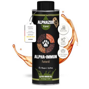 DEIN BEITRAG ZU VITALEM FELL UND WOHLBEFINDEN: ALPHAZOO ALPHA-IMMUN FUTTERÖL Verleihe dem Fell Deines Vierbeiners natürlichen Glanz und Vitalität mit dem Alpha-Immun Futteröl von ALPHAZOO. Entworfen für Hunde und Katzen, fördert dieses natürliche und nachhaltig produzierte Futteröl das allgemeine Wohlbefinden Deines besten Freundes. AKTIVES IMMUNÖL FÜR GLÄNZENDES FELL UND VITALE HAUT Das Alpha-Immun Futteröl ist nicht nur für glänzendes Fell und vitale Haut. Es wird bei unseren Kunden für seine Inhaltsstoffe geschätzt, die das aktive Wohlbefinden Deines Haustieres unterstützen können. NATÜRLICHES NASS- UND TROCKENFUTTER-UPGRADE Speziell konzipiert, um das Nass- und Trockenfutter Deines Haustieres aufzuwerten, bietet dieses Futteröl essenzielle mehrfach ungesättigte Fettsäuren wie Omega-3 und Omega-6. HOCHWERTIGE ÖLE FÜR DEIN HAUSTIER Unser Futteröl enthält eine exklusive Mischung aus Lachsöl, dem beliebten Fischöl, Leinöl aus goldenen Leinsamen, Nachtkerzenöl und Hagebutten-Kernöl. Diese Zutaten sind beliebt für ihre positiven Eigenschaften und bringen die natürliche Schönheit des Fells Deines Haustieres zum Strahlen. NACHHALTIG VERPACKT IN WEISSBLECHFLASCHE Das Alpha-Immun Futteröl kommt in umweltfreundlichen Weißblechflaschen. Diese Verpackung schützt das Öl vor Oxidation und Licht, hält es frisch und bewahrt seine Qualität. Weißblechflaschen sind robust und vollständig recycelbar. Biete Deinem Haustier das Beste mit ALPHAZOO Alpha-Immun Futteröl und erlebe, wie es zu glänzendem Fell und aktivem Wohlbefinden beitragen kann. Denn das Wohlergehen Deines Vierbeiners liegt Dir am Herzen, und wir sind hier, um Dich dabei zu unterstützen.