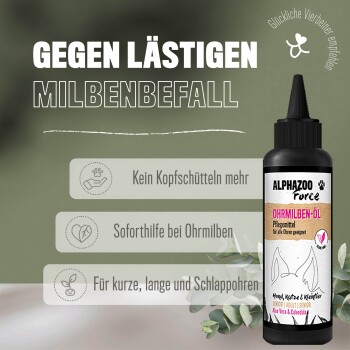 Das alphazoo Ohrmilbenöl für Hunde, Katzen, Kaninchen & Nager - Das Mittel gegen Ohrmilben Verabschiede Dich von den unangenehmen Ohrmilben – mit unserem alphazoo Ohrmilbenöl ! Dieses Öl wurde speziell entwickelt, um Juckreiz zu lindern und als Mittel gegen Milben im Ohr zu wirken. Es behandelt und schützt Dein Haustier effektiv vor Ohrmilben und unterstützt gleichzeitig die Geschmeidigkeit der Ohren. Ohrmilbenbefall schnell und rechtzeitig bekämpfen - mit unserem alphazoo Ohrmilbenöl Ohrmilben sind winzige Parasiten, die in den Gehörgängen von Haustieren, einschließlich Hunden, Katzen und Kaninchen, leben. Sie verursachen Juckreiz, Rötungen und Schwellungen, die zu einer Ohrräude führen können. Ohrmilben hinterlassen oft einen dunklen, krümeligen Schmutz, der wie Kaffeemehl aussieht. Ohne Behandlung können Ohrmilben zu einer ernsthaften Ohrenentzündung führen. Genau hier setzt unser alphazoo Ohrmilbenöl an. Die aktiven Inhaltsstoffe dieses Ohrentropfens gegen Ohrenmilben töten die Ohrmilben ab und unterstützen die Heilung des Ohres. Gleichzeitig beruhigt es den Juckreiz , sorgt für ein angenehmes Gefühl und fördert das allgemeine Wohlbefinden Deines Haustieres. Ohrenreiniger gegen Milben im Ohr und gegen Juckreiz Mit unserem alphazoo Ohrmilbenöl kannst Du ganz einfach vorbeugen und den lästigen Ohrenmilben den Kampf ansagen. Das Ohrmilbenöl ist nicht nur ein effektives Mittel gegen Milben im Ohr , sondern fungiert auch als Ohrenreiniger. Es hilft, Schmutz und Wachs aus dem Ohr zu entfernen, was die Umgebung für Ohrmilben unattraktiv macht. Die Anwendung vom Ohrmilbenöl für Hunde, Katzen, Kaninchen & Nager ist einfach und sicher. Du musst nur wenige Tropfen in das Ohr Deines Haustieres einträufeln. Die natürlichen Inhaltsstoffe Aloe Vera und Calendula / Ringelblume sorgen dafür, dass Dein Liebling bei der Reinigung und Entfernung von Ohrmilben, Ohrenschmalz und Schmutz kein Unbehagen verspürt. Kombiniere unser Ohrmilbenöl mit unserem alphazoo Ohrenreiniger Lauscher-Auf für die vollständige Reinigung der Ohren. 5 Gründe für unser sanftes Ohrmilbenöl Besonders sanfte Ohrenpflege & Ohrenreinigung Nachhaltig, kraftvolle Rezeptur gegen juckende Ohren Einfache Anwendung der Ohrentropfen Auch für empfindliche Hundeohren, Katzenohren & Tierohren geeignet Höchste Qualität, aus dem Ruhrgebiet für Dich Du wünschst Dir, dass Dein Tier gesund und glücklich ist, und genau das wollen wir auch. Mit den alphazoo Ohrentropfen gegen Milben helfen wir Dir, Deinem Ziel einen Schritt näher zu kommen. Kümmere Dich um die Ohrgesundheit Deines Haustiers und entscheide Dich für unser alphazoo Ohrmilbenöl – ein einfach anzuwendendes Mittel gegen Milben im Ohr und die besonders sanften Ohrentropfen gegen Ohrenmilben. Befreie Dein Haustier jetzt von unangenehmem Juckreiz und schlimmer Ohrräude durch fiese Ohrmilben! Leg einfach unser alphazoo Ohrmilbenöl in den Warenkorb , lehne Dich zurück und beobachte, wie das Lächeln zurück auf das Gesicht Deines liebsten Freundes kommt!