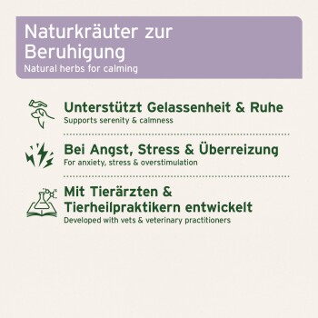 AniForte Calm & Relax besteht aus einer hochwertigen Kräutermischung mit rein natürlichen Rohstoffen. Die natürlichen Heilpflanzen unterstützen Deinen Hund bei Angst, Stress oder Nervosität und Überreizung und können zu mehr Gelassenheit und Ruhe verhelfen. Ausgeglichenheit und innere Ruhe auf natürliche Weise Unterstützung bei Angst, Stress, Nervosität und Überreizung Kräutermischung aus rein natürlichen Rohstoffen und Heilpflanzen Viele Faktoren können bei Hunden zu einer inneren Unruhe, Nervosität, Angst und Stress führen. Vorübergehende ernährungsbedingte Mangelerscheinungen oder besondere Situationen wie geänderte Lebensumstände, ein Umzug oder Silvesterfeuerwerk beeinflussen das Gemüt Deines Lieblings. AniForte Calm & Relax ist eine rein natürliche Kräutermischung aus Baldrianwurzel, Hopfenblättern, Melisse und Passionsblumenkraut. Die hochwertigen Rohstoffe unterstützen die Ausgeglichenheit und innere Ruhe Deines Hundes auf natürliche Weise. So sind besondere Anforderungen und Situationen im Alltag einfacher und entspannter für Hund und Halter zu meistern.
