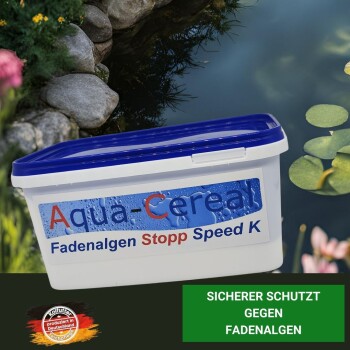 Mit Fadenalgen Stopp Speed K haben wir eine seit Jahren erprobte Zusammensetzung für uns noch einmal verbessern lassen. Die Wirkstoffformel ist eine effektive und einfache Lösung zur Bekämpfung von Fadenalgen. Durch die neue Zusammensetzung ist Fadenalgen Stopp Speed K nun noch effektiver, ergiebiger und wirkt auch temperaturunabhängig. Fadenalgen Stopp Speed K versorgt das Teichwasser mit lebenswichtigen Mineralien. Es stabilisiert die Karbonathärte, die Gesamt-härte und den pH-Wert . So ist ein sicheres Säurebindungsvermögen gewährleistet und ein Abfallen des pH-Wertes wird sicher vermieden. Weiter werden durch optimale biologische Bedingungen Nährstoffe schneller verarbeitet und somit den Algen die Nährstoffe entzogen. Durch diesen Nährstoffentzug wird das Algenwachstum sichtlich gestoppt und die Abgabe von Algensporen verhindert. Fadenalgen Stopp Speed K ist absolut phosphatfrei und ungiftig für Mensch und Tier. Es kann daher auch in Schwimmteichen eingesetzt werden. Der Einsatz des Mittels ist temperaturunabhängig und die Wirkung setzt innerhalb von 3 bis 4 Tagen ein. Anwendung: Man gebe 250g Fadenalgen Stopp Speed K auf 10.000 Liter Teichwasser. Die Zugabe sollte bei der ersten Anwendung 2x im Monat erfolgen. Ist der Teich frei von Algen, genügt 1x pro Monat eine Dosierung zum Vorbeugen. So bleibt ihr Gartenteich das ganze Jahr algenfrei. Wirkstofflösung: Salicylsäure 0,160g/100g Nicht anzuwenden bei Tieren, die zur Herstellung von Lebensmittel dienen. Achtung: Biozide sicher verwenden! Vor Gebrauch sorgfältig die Produktinformation lesen. Nicht überdosieren! Verträglich für Mikroorganismen, Fische und Wasserpflanzen. Bei sachgemäßer Anwendung konnten keine Nebenwirkungen festgestellt werde. Hinweis: Packung nur völlig restentleert der Wertstoffsammlung zuführen. Darf nicht in die Hände von Kindern gelangen. Phosphatfrei. Anwendung auch bei Temperaturen unter 10° Wassertemperatur Warum wirkt Fadenalgen Stop Speed K von Aqua-Cereal so einfach und effektiv? Bei diesem Produkt handelt es sich um eine Wirkstoff-Formel ohne jegliche Zusätze von Algiziden. Die Alge löst sich auf und das Absterben selbiger beginnt. Das Produkt ist absolut Phosphat-frei! Ab welcher Temperatur kann ich Fadenalgen Stopp Speed K anwenden? • Das neue Fadenalgen Stopp Speed K ist temperaturunabhängig. Sie können es auch im Winter einsetzen. Beachten Sie jedoch, wenn Sie das Mittel anwenden, sterben auch Ihre Algen ab. Daher sollte auch der Filter laufen, damit die abgestorbenen Partikel Ihrem Wasser entzogen werden können. Manchmal lässt die Wirkung früher nach - was könnte die Ursache sein? • Sollte es stark regnen oder Sie einen Wasserwechsel vorgenommen haben - bitte nachdosieren Fadenalgen Stopp Speed K von Aqua-Cereal ist auch bei einer Überdosierung (bis zu einer dreifachen Menge) absolut unschädlich für Fische und Pflanzen. Es enthält keinerlei Algizide oder Biozide. Damit auch bei Ihnen Fadenalgen Stopp Speed K erfolgreich wirkt, beachten Sie bitte folgendes: Die Dosierung muss dem tatsächlichen Wasservolumen entsprechen. Gerade in der Anfangsphase lieber etwas mehr dosieren, als zu wenig. Dosierung von Fadenalgen Stopp Speed K: Im ersten Monat dosieren Sie im Abstand von 14 Tagen 250 Gramm auf 10.000 Liter Teichwasser. Anschließend einmal im Monat die die errechnete Menge nachdosieren. Die abgestorbenen Algen werden über den Filter entsorgt, oder abgesaugt. Bei optimaler Dosierung wachsen Algen nicht mehr nach. Bitte kontrollieren Sie vor der Anwendung den KH und GH Wert und stabilisieren diese, wenn notwendig. Unser Produkt ist registriert unter baua: Reg.-Nr: N-105229 Wirkstoff: Salicylsäure wirksame Bestandteile 0,016 g/kg Kennzeichnung gem. EU-Richtline 08/8 EG: Algizide sicher verwenden! Vor Gebrauch stets Kennzeichnung und Produktinformation lesen!