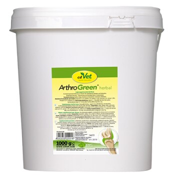 Ergänzungsfuttermittel für Pferde Zur bedarfsgerechten Fütterung von Pferden mit empfindlichen Gelenken und Gliedmaßen Intervallweise Fütterung - Unterstützung auch bei angelaufenen Beinen, Strukturkräuter Die aus rein natürlichen Quellen enthaltenen Mineralien und ätherischen Öle im ArthroGreen herbal können die Selbstheilungskräfte unterstützen und das Wohlbefinden des Pferdes verbessern. Fehlernährung und mangelnde Bewegung verschlechtern die Stoffwechselvorgänge im Knorpel und damit dessen Qualität. Hinzu kommen altersbedingt eine allgemeine Aktivitätsverringerung des Stoffwechsels im gesamten Organismus. Diese Vorgänge führen über die Verschlechterung der Knorpelqualität zu einer Verminderung der Belastbarkeit. ArthroGreen herbal setzt genau hier an und regt durch den hohen Gehalt an natürlicher Kieselsäure den Binde- und Stützgewebsstoffwechsel an. Zusätzlich wird die Durchblutung angeregt und die schnellere Regeneration gefördert. Zusammen mit Leber- und Nieren unterstützenden Kräutern können Giftstoffe leichter vom Körper ausgeschieden und Flüssigkeitsansammlungen im Gewebe in ihrem Abtransport gefördert werden. Synergistische Kräutermischung Hoher Kieselsäuregehalt Unterstützt den Gelenkstoffwechsel Zusammensetzung: Ingwer, Ginkgoblatt, Birkenblatt, Brennnesselkraut, Mariendistelkraut, Löwenzahnkraut, Löwenzahnwurzel Analytische Bestandteile: Rohprotein 12,5%, Rohfett 3,2%, Rohfaser 13,8%, Rohasche 9,3%, Kalzium 1,34%, Phosphor 0,27%, Natrium 0,4% Fütterungsempfehlung: Täglich 15-25 g/Tier über das Futter geben. Bei besonderem Bedarf kann die Fütterungsmenge verdoppelt werden. 1 EL entspricht ca. 2,5 g.