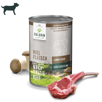 BALDUIN ist ein vollwertiges Hundenassfutter, mit dem Du eine artgerechte und umweltverträgliche Ernährung Deines vierbeinigen Begleiters in Einklang bringen kannst.Eine Mahlzeit enthält dabei genau soviel zartes Fleisch, wie Dein Hund für ein naturgesundes Leben braucht. Das frische Muskelfleisch, ergänzt um wertvolle Innereien, versorgt Deinen treuen Freund mit essenziellen Proteinen und wichtigen natürlichen Nährstoffen.In jedem Menü von BALDUIN steckt aber nicht nur viel Fleisch, sondern noch viel mehr Nachhaltigkeit. Deshalb wird einen Teil des Fleischs durch ein echtes Nachhaltigkeitswunder – den Kräuterseitling – ersetzt. So kann der Fleischkonsum verringert werden. Das spart wertvolles Wasser, reduziert CO2-Emissionen, schont Ressourcen und verbessert die Haltungsbedingungen in der tierischen Landwirtschaft. Zudem liefert dieser fettfreie und kalorienarme Fleischersatz, neben einer Extraportion Eiweiß, reichlich Ballaststoffe und Vitamine, Spurenelemente und Mineralien.Im Mix-Paket 2 enthalten sind die Sorten Pute und Lamm, jeweils mit einer Kombination aus bestem Fleisch und in Österreich angebautem Kräuterseitling. Zum Wohlergehen Deines Hundes werden alle Zutaten sorgfältig kontrolliert. Auf Getreide, künstliche Aromen, Farbstoffe und Konservierungsmittel wird komplett verzichtet. So entsteht eine sehr bekömmliche, genussvolle und ausgewogene Mahlzeit, die auch Dein Hund lieben wird.Gut für Deinen Hund.Gut für Deine schöne neue Welt.