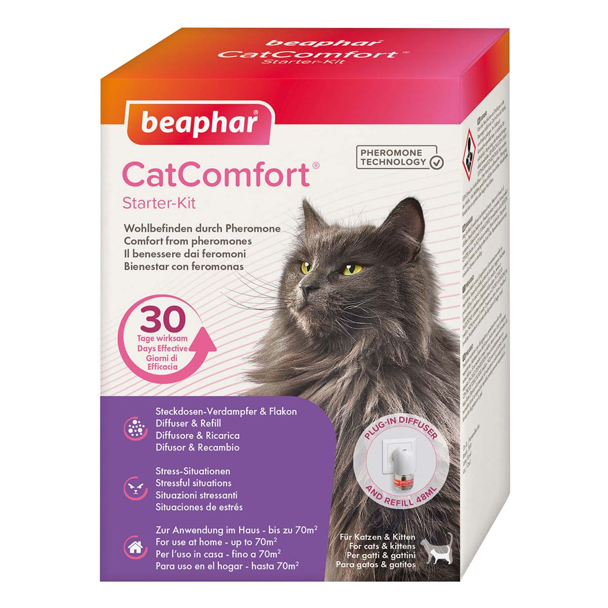 Beaphar CatComfort Excellence kombiniert gleich 2 verschiedene Pheromone miteinander (2 in 1 Pheromon-Technologie). Während das „Katzen-Gesichtspheromon“ zur Beruhigung und zum Wohlbefinden der Katze beiträgt, fördert das „mütterliche Beruhigungspheromon“ (Appeasing Pheromone) die Harmonie unter zusammenlebenden Katzen. Helfe deiner Katze durch stressige Zeiten! Starter-Kit.