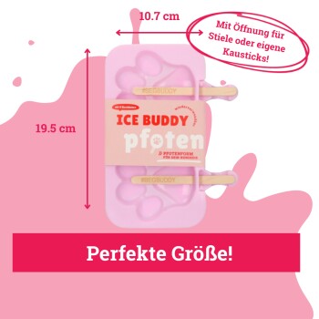 Fülle diese stylische Pfotenform mit einem unserer Eispulver und kreiere eine leckere Abkühlung für Deinen Hund. Unsere wiederverwendbare Eisform eignet sich auch perfekt zum Umsetzen eigener Rezeptideen für Dein Eis. Nach dem Einfrieren einfach ausspülen und wiederverwenden. Stell Dir die Zutaten für Dein Hundeeis nach Lust und Laune zusammen und kreiere mit unserer Form ein einzigartiges Ergebnis.Die Form eignet sich auch zum Backen von Hundekeksen. Bitte davor die Stiele entfernen.