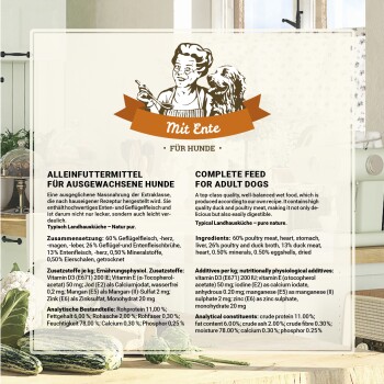 BETTY’S LANDHAUSKÜCHE mit EnteEnte und Geflügel ist eine ausgeglichene, sehr schmackhafte Nassnahrung der Extraklasse, die nach hauseigener Rezeptur hergestellt wird. Sie enthält hochwertiges Enten- und Geflügelfleisch und ist darum nicht nur lecker, sondern auch leicht verdaulich.Für wen ist das?Wir empfehlen Ente und Geflügel besonders für magensensible, aber natürlich auch für alle ausgewachsene normal aktive Hunde.Was ist drin?Der Fleischanteil liegt bei 73 %, hinzukommen lediglich Fleischbrühe, wichtige Mineralstoffe und getrocknete Eierschalen, die die optimale, natürliche Kalziumversorgung gewährleisten.Wie wird`s gemacht?Für unser Nassfutter verwenden wir ausschließlich Rohstoffe in höchster Qualität und keine Abfallprodukte. Es wird schonend in Fleischbrühe gegart, nicht in Wasser, damit alle Nährstoffe, die das Fleisch von Natur aus mitbringt auch erhalten bleiben und so eine natürliche Nährstoffversorgung gewährleisten.Gönnen Sie Ihrem Hund dieses unverfälschte, hochwertige Nassfutter – es schmeckt nicht nur richtig gut, es versorgt Ihr Tier auch mit allem, was es wirklich braucht und das in bester Qualität.Eben typisch Bettys Landhausküche – Natur pur!