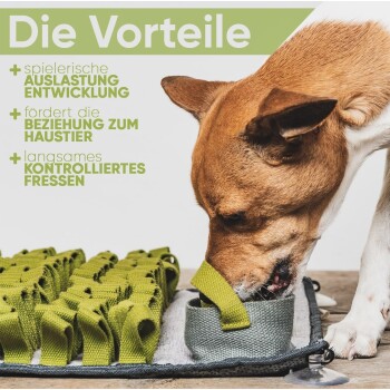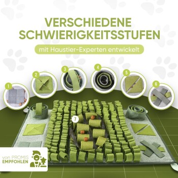 Der BOBBYS WELT Schnüffelteppich für Hunde bietet eine herausragende Möglichkeit, die geistige und körperliche Auslastung Ihres Hundes zu fördern. Mit sieben verschiedenen Schwierigkeitsstufen stellt der Teppich sicher, dass Ihr Hund kontinuierlich gefordert wird, egal ob er ein Welpe, ein erwachsener Hund oder ein älteres Tier ist. Der Teppich ist aus besonders widerstandsfähigen Materialien wie bissfester Baumwolle, robustem Oxfordgewebe und hochwertigem Premium-Filz gefertigt. Diese sorgen dafür, dass der Teppich lange hält, auch bei intensiver Nutzung. Die dreilagige Struktur garantiert zusätzliche Stabilität und Haltbarkeit. Die Schnüffeldecke ist mit einer patentierten Antirutsch-Unterseite ausgestattet, die dafür sorgt, dass der Teppich sicher an Ort und Stelle bleibt, während Ihr Hund seine Such- und Schnüffelspiele genießt. Der Teppich ist nicht nur praktisch, sondern auch umweltfreundlich, da bei der Herstellung ausschließlich schadstofffreie Materialien verwendet werden. Besonders hervorzuheben ist die einfache Pflege – der Teppich lässt sich entweder von Hand oder bequem in der Waschmaschine bei 30° reinigen, was ihn besonders pflegeleicht und langlebig macht. Dank seiner vielseitigen Anwendungsmöglichkeiten, auch als Geschenk, ist der Schnüffelteppich ein absolutes Muss für jeden Hundebesitzer, der das Wohl seines Tieres fördern möchte.