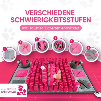 Der BOBBYS WELT Schnüffelteppich für Hunde bietet eine herausragende Möglichkeit, die geistige und körperliche Auslastung Ihres Hundes zu fördern. Mit sieben verschiedenen Schwierigkeitsstufen stellt der Teppich sicher, dass Ihr Hund kontinuierlich gefordert wird, egal ob er ein Welpe, ein erwachsener Hund oder ein älteres Tier ist. Der Teppich ist aus besonders widerstandsfähigen Materialien wie bissfester Baumwolle, robustem Oxfordgewebe und hochwertigem Premium-Filz gefertigt. Diese sorgen dafür, dass der Teppich lange hält, auch bei intensiver Nutzung. Die dreilagige Struktur garantiert zusätzliche Stabilität und Haltbarkeit. Die Schnüffeldecke ist mit einer patentierten Antirutsch-Unterseite ausgestattet, die dafür sorgt, dass der Teppich sicher an Ort und Stelle bleibt, während Ihr Hund seine Such- und Schnüffelspiele genießt. Der Teppich ist nicht nur praktisch, sondern auch umweltfreundlich, da bei der Herstellung ausschließlich schadstofffreie Materialien verwendet werden. Besonders hervorzuheben ist die einfache Pflege – der Teppich lässt sich entweder von Hand oder bequem in der Waschmaschine bei 30° reinigen, was ihn besonders pflegeleicht und langlebig macht. Dank seiner vielseitigen Anwendungsmöglichkeiten, auch als Geschenk, ist der Schnüffelteppich ein absolutes Muss für jeden Hundebesitzer, der das Wohl seines Tieres fördern möchte.
