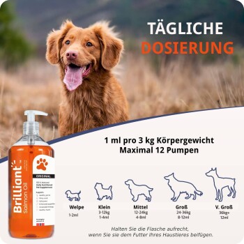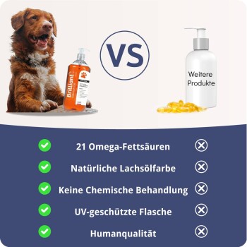 GELIEBT VON HUNDEN, KATZEN & HAUSTIEREN: Wir haben unser Produkt geschmacklich getestet, um sicherzustellen, dass Haustiere es lieben – 100 % bevorzugten Brilliant Lachsöl gegenüber anderen! Keine Kapseln mehr notwendig – einfach unser flüssiges Öl auf Hundefutter, Katzenfutter oder die Mahlzeit Ihres Haustiers pumpen und die Ergebnisse innerhalb weniger Tage sehen!