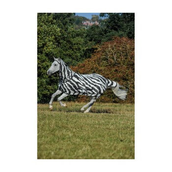 Die Fliegendecke Buzz-Off Zebra Full Neck von Bucas ist ein innovative Insektenschutz für dein Pferd. Diese Fliegendecke vereint einzigartige Eigenschaften, um es effektiv vor Insekten und Sonneneinstrahlung zu schützen. Durch den Einsatz des innovativen Zebramusters, das wissenschaftlich erwiesen Fliegen irritiert und fernhält, bietet die Bucas Buzz-Off Zebra Full Neck Fliegendecke einen außergewöhnlichen Schutz. Das leichte, feinmaschige Material schützt selbst vor den kleinsten Insekten und sorgt gleichzeitig für Komfort. Das reflektierende Silber-Äußere der Decke schützt dein Pferd vor der Hitze und den schädlichen UV-Strahlen der Sonne. Sie verringert die Einstrahlung des UV-Lichts sogar um ca. 75 %. Die Schulterfalten sorgen für eine maßgeschneiderte Passform im Brust- und Schulterbereich und sind ein charakteristisches Designmerkmal von Bucas. Die T-Verschlüsse an der Brust und der Snap-Lock-Magnetverschluss gewährleisten, dass die Decke sicher an deinem Pferd sitzt. Eine Schweifkordel verhindert, dass sich die Decke auf dem Rücken des Pferdes umschlägt und sorgt zusätzlich für Sicherheit. Beinschnüre sind beim Kauf dieser Decke ebenfalls inkludiert. Bitte beachte, dass das Halsteil dieser Decke nicht abnehmbar ist.