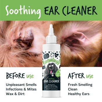 Bugalugs Dog Ear Cleaner – Sanfte Ohrreinigungslösung für Hunde Der Bugalugs Dog Ear Cleaner ist die perfekte Ergänzung zur Pflegeroutine deines Hundes. Unsere sanfte, natürlich gewonnene Formel beruhigt juckende Ohren, reduziert Ohrgerüche und entfernt Wachs sowie Schmutz. Geeignet für Hunde ab 8 Wochen. Produktmerkmale: Sanfte Reinigung – Entfernt Wachs und Schmutz aus den Ohren deines Hundes. Reduziert Ohrgerüche – Hilft, unangenehme Gerüche zu beseitigen. Beruhigt juckende Ohren – Lindert Unbehagen durch Juckreiz. Natürliche Inhaltsstoffe – Hergestellt aus 100 % natürlich gewonnenen Zutaten. Frei von schädlichen Chemikalien – Ohne Alkohol, Parabene, Silikone, SLES, SLS, DEA und Enzyme. Einfach anzuwenden – Praktische Tropfflasche für gezielte Anwendung. Anwendung: Trage die Lösung vorsichtig in das Ohr deines Hundes auf, massiere sanft die Basis des Ohrs und wische überschüssige Flüssigkeit mit einem sauberen Tuch oder Wattepad ab. Wiederhole den Vorgang bei Bedarf. Hinweis: Nur zur äußerlichen Anwendung. Außerhalb der Reichweite von Kindern aufbewahren. Bei Kontakt mit den Augen sofort gründlich mit Wasser abspülen. Bei anhaltenden Ohrproblemen einen Tierarzt konsultieren.
