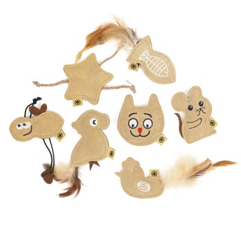 Verwöhne deinen Stubentiger mit unserem hochwertigen Katzenkissen-Set aus weichem Kuhleder. Das Set besteht aus 7 handgefertigten Spielkissen, die speziell für den Spiel- und Kuschelspaß deiner Katze entworfen wurden. Das macht die Kissen besonders: Edles Material: Gefertigt aus geschmeidigem und robustem Kuhleder – langlebig und natürlich. Mit Katzenminze gefüllt: Der unwiderstehliche Duft regt deine Katze zum Spielen an und sorgt gleichzeitig für Entspannung. Perfekte Größe: Die Kissen liegen ideal in kleinen Pfoten und sind perfekt zum Anknabbern und Herumtragen. Vielseitig einsetzbar: Ob zum Toben, Kuscheln oder Relaxen – diese Kissen passen immer! Warum deine Katze sie lieben wird: Die natürliche Lederstruktur kombiniert mit dem betörenden Duft der Katzenminze sorgt für stundenlangen Spielspaß und hilft deiner Katze gleichzeitig, zu entspannen und sich wohlzufühlen. Warum Katzenminze für Katzen? Katzenminze wirkt anregend auf Katzen, indem sie den Spieltrieb weckt und für ausgelassene Bewegung sorgt. Nach dem Spielen hilft ihr Duft, Stress abzubauen und die Katze zu entspannen – eine natürliche und sichere Freude für jeden Stubentiger! Das Set beinhaltet folgende Motive: Katzenkopf, Maus, Huhn, Pferdchen, Käfer, Stern & Fisch Größe der Kissen: Variiert zwischen 6-10 cm je Seite