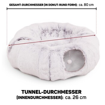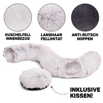 Das zusätzliche flauschige Kissen mit einer Anti-Rutsch-Unterseite in der Mitte des Tunnels, sorgt für einen zusätzlichen Liegeplatz mit hohem Komfort und schafft bei Bedarf einen zentralen Ruheplatz inmitten des Tunnels. Egal ob Sie den Tunnel als eine Einheit verwenden oder die beiden Teile separat platzieren, der Spaß für die Katze ist in jedem Fall garantiert. Die Flexibilität, die Ihnen dieser Katzentunnel bietet, ist dabei besonders Praktisch: Sie können die beiden Tunnelteile bei Bedarf verteilen und so Ihrer Katze neue Spiel- und Entspannungsbereiche schaffen oder aber den Tunnel als runden "Donut-Tunnel" zusammensetzen - auch grenzenlos erweiterbar mit weiteren Tunnelteilen! Die Teile werden durch Schlaufen verbunden und können theoretisch auch mit anderen Tunneln desselben Durchmessers verbunden werden. Der Tunnel wird allgemein durch die eingearbeiteten Drähte in Form gehalten. Als weitere Spielanregung ist ein herunterbaumelndes Plüschbällchen am Eingang des Tunnels eingearbeitet. Dieser Tunnel ist ideal für neugierige Katzen, die gerne ihre Umgebung erkunden und sich spielerisch gern Verstecken. Der Donut-förmige Katzentunnel Otis von CanadianCat ist nicht nur ein großartiges Spielzeug, sondern auch ein gemütlicher Rückzugsort für Ihre Katze. Katzen die verstärkt Ihren Höhlen-Instinkt ausleben wollen, finden mit dem Tunnel einen geeigneten Rückzugsort & Spielplatz. Auf einen Blick: Donut-förmiger Katzentunnel von CanadianCat Länge der einzelnen Tunnel: ca. 80 cm Durchmesser des Tunnels: ca. 26 cm Durchmesser des Kissens: ca. 45 cm Zwei identische Tunnelteile mit Verbindungsschlaufen Flauschige Langfell-Imitat-Außenseite für Komfort Zusätzliches flauschiges Kissen in der Mitte mit Anti-Rutsch-Unterseite Flexibel nutzbar und erweiterbar, auch als "Donut-Tunnel" zusammensetzbar Möglichkeit zur Verbindung mit anderen Tunneln desselben Durchmessers Enthält ein herunterbaumelndes Plüschbällchen am Eingang für Spielanreiz