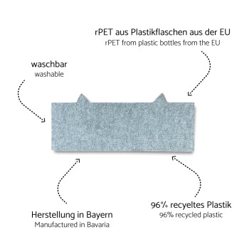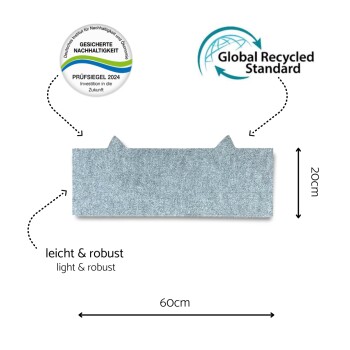Wo ist der Lieblingsplatz der meisten Katzen? Richtig, die Fensterbank! Genau dafür haben wir nun auch die leichte Liegematte aus recycelten Plastikflaschen konzipiert. Mit ihren Maßen von ca. 20/24* x 65 cm passt sie da nämlich perfekt hin – so wird es nachhaltig & bequem beim "Katzenfernsehen". Die Matte wird aus 96% recyceltem Plastik in Bayern hergestellt. Im schicken Grau ist die süße Liegematte mit Katzenohren außerdem ein elegantes Accessoire für Eure Wohnungseinrichtung.Die Liegefläche entspricht 60 x 20 cm - inklusive der Katzenohren hat die Matte eine Breite von 24cm.Schenke Deiner Katze mit unserer leichten Liegematte eine entspannte Auszeit. Egal ob zum Beobachten am Fenster, für ein kuschliges Schläfchen oder einfach nur, um gemütlich zu chillen ist diese Katzenmatte einfach perfekt.• Von Katzen getestet: für kleine Kitten und große Stubentiger • Nachhaltig: Aus 96% recycelten Plastikflaschen• Leidenschaft: innovatives Upcycling, um Ressourcen zu schützen• Herstellung in DE: Produktion in Bayern • Sicher: robust und kuschlig zugleich• Waschbar: Handwäsche mit einer milden Seife; liegend trocknenCATLABS ist stets innovativ und modern - nur das Beste für Deine Katze und Euren KatzenhaushaltMit den Maßen von 24 x 60 cm passt die Matte auf die meisten Fensterbretter und eignet sich perfekt fürs „Katzenfernsehen“. Aber natürlich auch für jeden anderen Lieblingsplatz Deiner Katze ist die Liegematte ein stilvoller Hingucker mit süßen Katzenohren. Für die Verwendung auf einer Treppenstufe empfehlen wir, eine Anti-Rutschmatte unterzulegen.