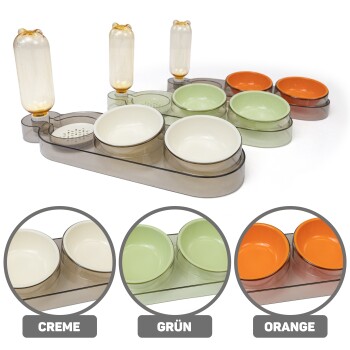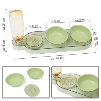 3-in-1 Futterstation mit Näpfen & Wasserspender – praktisch, hygienisch & langlebig Mit der 3-in-1 Futterstation bieten Sie Ihrem Haustier gleichzeitig Trockenfutter, Nassfutter und frisches Wasser – ohne mehrere Schalen verwenden zu müssen. Die clevere Kombination aus zwei Näpfen und einem Wasserspender sorgt für eine saubere und organisierte Fütterung. Hochwertig & langlebig Gefertigt aus robusten, sicheren Materialien, bietet diese Futterstation eine lange Lebensdauer und ist perfekt für den täglichen Gebrauch. Einfache Reinigung & Spülmaschinenfest Die glatten Oberflächen lassen sich mühelos abwischen oder in der Spülmaschine reinigen – für maximale Hygiene ohne Aufwand. Ideal für Katzen & kleine Hunde Ob Kitten, erwachsene Katzen, Welpen oder kleine Hunde – die 3-in-1-Futterbar ist für Haustiere jeder Größe geeignet. Produktdetails:Gesamtgröße der Futterstation: 47 x 15 x 22 cm Futternapf-Durchmesser: 13 cm Wassernapf-Durchmesser: 10 cm Flaschenvolumen: 500 ml