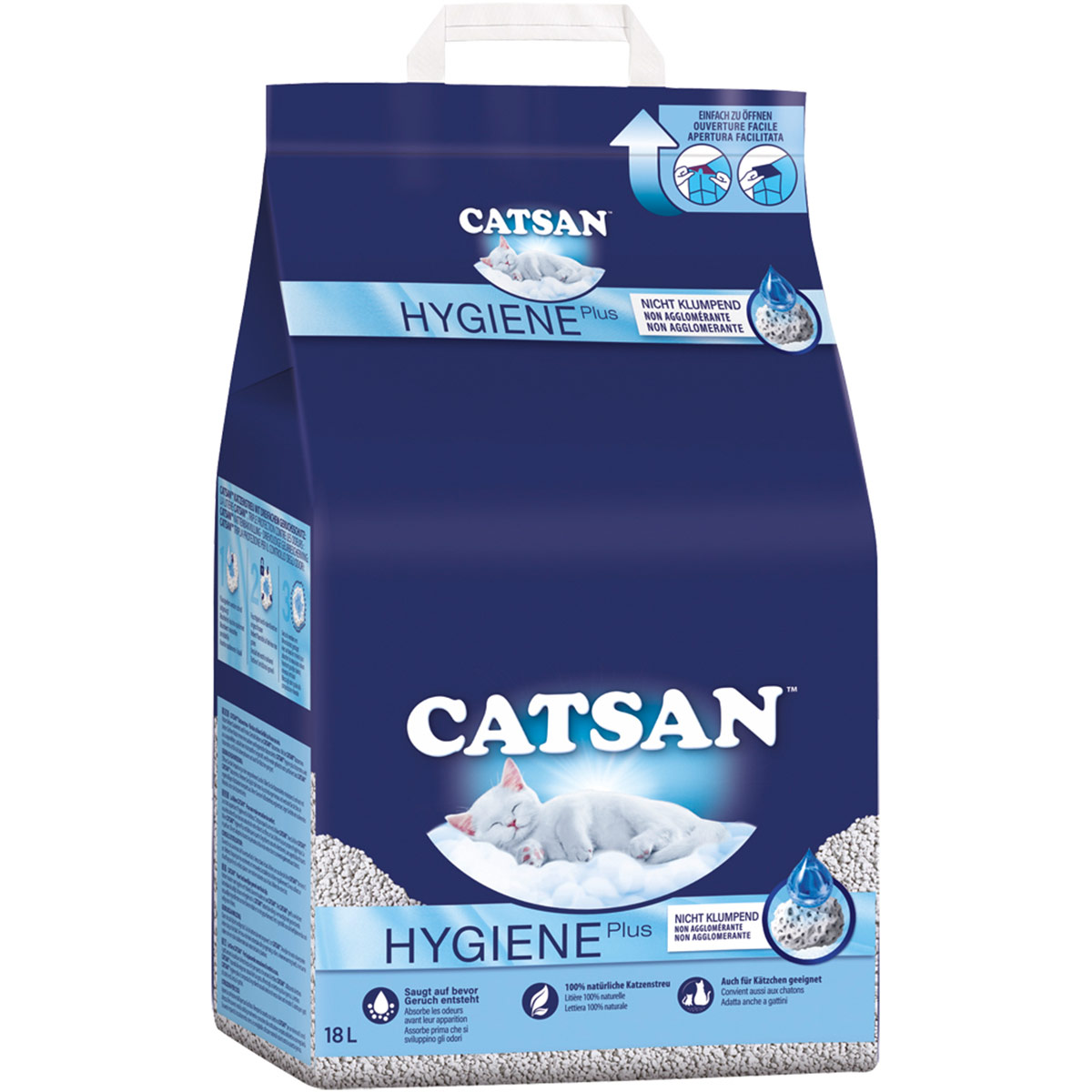 CATSAN Hygiene Plus ist eine hochwirksame, nicht-klumpende Katzenstreu, die Flüssigkeit schnell und effektiv aufsaugt, bevor Geruch entsteht.