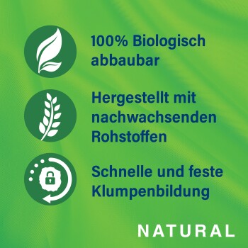 CATSAN™ NATURAL – Die natürliche Klumpstreu – Hergestellt in Deutschland CATSAN™ NATURAL Klumpstreu ist zu 100% natürlich, 100% biologisch abbaubar und basiert ausschließlich auf pflanzlichen nachwachsenden Rohstoffen. Die natürlich wohlriechende Katzenstreu überzeugt durch eine effektive Geruchskontrolle, schließt Gerüche somit sofort ein und bildet umgehend feste Klumpen, die direkt entnommen werden können. CATSAN™ NATURAL Klumpstreu ist ein Leichtgewicht unter den Klumpstreu und wird in Deutschland hergestellt. CATSAN™ NATURAL Klumpstreu ist eine gute Wahl für Katzen, Menschen und die Umwelt. So einfach gehts: Füllen Sie Ihre Katzentoilette mit Katzenstreu bis mind. zu einer Höhe von 5cm Entfernen Sie täglich die Klumpen und füllen Sie mit neuer Streu wieder auf. Reinigen Sie die Katzentoilette vollständig alle 2 bis 4 Wochen Hinweis: Wenn Sie eine Fußbodenheizung haben, legen Sie bitte isolierendes Material unter die Katzentoilette. Bitte trocken lagern!