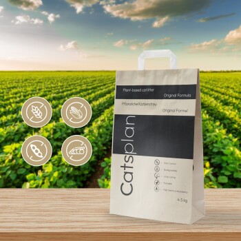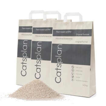 Premium-Katzenstreu aus 100% natürlichen Inhaltsstoffen – nachhaltig und umweltfreundlich im PapierbeutelCatsPlan original bietet die perfekte Balance zwischen Funktionalität, Nachhaltigkeit und Komfort. Diese innovative Katzenstreu wird aus sorgfältig ausgewählten Pflanzenfasern und Stärke gefertigt, was sie zu einer umweltbewussten und hochleistungsfähigen Lösung für anspruchsvolle Tierhalter macht. Sie überzeugt durch überragende Saugkraft, schnelle Klumpenbildung und effektive Geruchsneutralisation. Zudem ist sie vollständig kompostierbar und unterstützt eine nachhaltige Entsorgung. Dank eines optimierten Staubreduktionsprozesses ist sie nahezu staubfrei und sorgt so für die Gesundheit Ihrer Katze und eine saubere Umgebung.Produkteigenschaften:[100% natürliche Inhaltsstoffe]: Gefertigt aus hochwertiger Sojafaser, Erbsenfaser und Maisstärke – garantiert chemiefrei, biologisch abbaubar und sicher für Tier und Umwelt. [Exzellente Geruchsbindung]: Die pflanzlichen Fasern binden Gerüche effizient und sorgen für langanhaltende Frische. [99,9% staubfrei]: Fortschrittliche Staubreduktionsverfahren gewährleisten eine nahezu staubfreie Nutzung, ideal für empfindliche Katzen und staubfreie Wohnräume.[Ergiebig und wirtschaftlich]: Mit außergewöhnlicher Saugkraft reicht eine 4,5-kg-Packung für eine Katze bis zu einem Monat – optimal für umweltbewusste Tierhalter.[Nachhaltig kompostierbar]: Klumpen können sicher als organischer Dünger verwendet werden, was die Entsorgung vereinfacht und Abfälle reduziert.