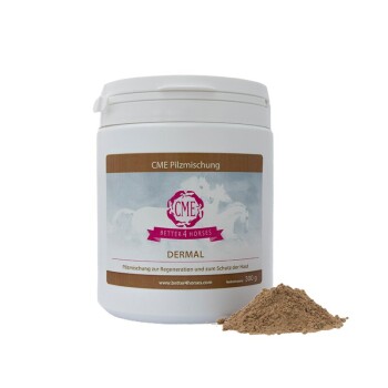 CME Dermal ist eine Mischung aus wertvollen Pilzen und weiteren ernährungsphysiologisch wichtigen Bestandteilen mit essentiellen Fettsäuren, Antioxidantien und Lebendhefe zur Unterstützung u.a. bei ernährungsbedingten Hautproblemen und unterstützt die Haut dabei, sich vor schädlichen Umwelteinflüssen zu schützen. VORTEILE AUF EINEN BLICK: enthält zahlreiche Biovitalstoffe kann Selbstheilungskräfte aktivieren kann das Immunsystem unterstützen CME Pilze bewähren sich bereits seit 2010 täglich in der Praxis. Die Pilze enthalten sekundäre Nährstoffe und sind reich an Biovitalstoffen. Zusammen mit dem Verzicht auf Füllstoffe und der ständig geprüften höchsten Qualität macht das den Erfolg der CME Pilzmischungen aus. Vom Tierarzt entwickelt, von Tierärzten und THPs empfohlen.