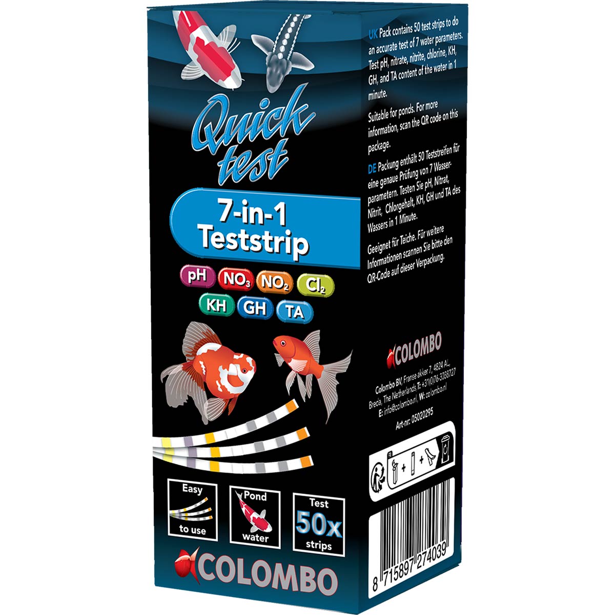 Colombo 7in1 Quicktest: Schnelltest für Süßwasser. Teste die 7 wichtigsten Wasserwerte in nur einer Minute. Enthält 50 Teststreifen für pH, KH, GH, NO2, NO3, TA und CL.