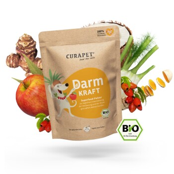DarmKraft – Bio-Darmkur für Hunde mit Pro- und Präbiotika DarmKraft ist ein hochwertiges Ergänzungsfuttermittel in Bio-Qualität zur Unterstützung der Verdauung und des Darmgleichgewichts bei Hunden. Die Kombination aus ausgewählten Probiotika, Präbiotika, pflanzlichen Ballaststoffen und Heilkräutern kann zum Aufbau und Erhalt einer gesunden Darmflora beitragen – besonders bei ernährungssensiblen Hunden oder nach Phasen mit weichem Kot, Blähungen oder Futterumstellungen. Das fein vermahlene Pulver enthält natürliche Inhaltsstoffe wie Inulin aus Topinambur, Apfelpektin sowie die probiotischen Bakterienstämme Enterococcus faecium , Lactobacillus acidophilus und Bacillus subtilis , die die normale Verdauungsfunktion unterstützen können. DarmKraft eignet sich ideal für: Hunde mit sensibler Verdauung oder weichem Kot Phasen nach Futterumstellung oder Antibiotikagabe Die tägliche Unterstützung der Darmflora und Verdauung Die Rezeptur wurde gemeinsam mit Ernährungsexpert:innen entwickelt und enthält ausschließlich Zutaten aus kontrolliert biologischem Anbau. Frei von Zusatzstoffen, Konservierungsmitteln und künstlichen Aromen – für beste Verträglichkeit, auch bei empfindlichen Tieren. Produktvorteile im Überblick: Enthält Pro- und Präbiotika zur Unterstützung der Darmfunktion Bio-zertifizierte Zutaten, schonend verarbeitet Ohne künstliche Zusätze oder versteckte Inhaltsstoffe Für ernährungssensible Hunde geeignet Hohe Akzeptanz – einfach unter das tägliche Futter mischen