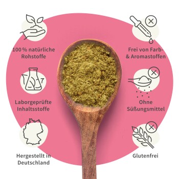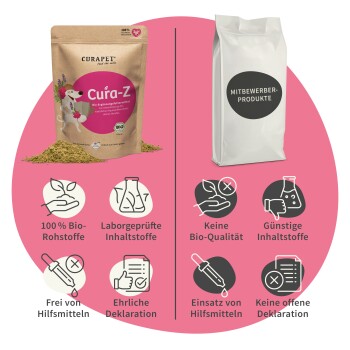 - 100 % natürliches Ergänzungsfuttermittel- Ausgewogene Komposition bewährter Zutaten- Laborgeprüfte Reinheit - Als Ergänzung für jedes Fütterungskonzept geeignet - Gemeinsam mit Tierheilpraktikern und Ernährungsberatern entwickelt - Ehrliche Deklaration: KEINE versteckten Zusatzstoffe - In Deutschland entwickelt und produziert - Einfache Anwendung: ins Hundefutter mischenIm Frühling, Sommer und Herbst kommt es bei Hunden besonders auf den Geruch an. Je weniger dein Hund für anderen nach Hund duftet, umso besser. Deshalb haben wir gemeinsam mit Tierheilpraktikern und Ernährungsexperten unser Cura-Z Pulver entwickelt. Bewährte natürliche Zutaten wie Zistrose, Lavendel, Schwarzkümmel und Co. können das Haut- und Fellmilieu deines Hundes vorübergehend verändern. Dir selbst wird die Geruchsveränderung wahrscheinlich nicht auffallen, anderen aber schon. Und das ist die Hauptsache, oder?