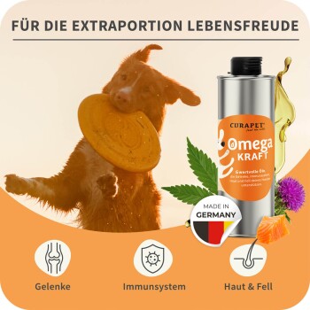 OmegaKraft – Ergänzungsfuttermittel mit natürlichen Ölen zur Versorgung mit essenziellen Fettsäuren Fett ist nicht gleich Fett – das gilt auch für unsere Vierbeiner. Für das allgemeine Wohlbefinden benötigen Hunde hochwertige Fettsäuren, insbesondere Omega-3, -6 und -9. Diese mehrfach ungesättigten Fettsäuren sollten in einem ausgewogenen Verhältnis vorliegen und über die tägliche Fütterung aufgenommen werden. CURAPET OmegaKraft enthält eine fein abgestimmte Kombination aus sechs bewährten Ölen – darunter Lachsöl, Hanföl und Leinöl – und liefert essenzielle Fettsäuren in Premiumqualität. Die enthaltenen Bestandteile wie EPA und DHA sind bekannt aus der ernährungsphysiologischen Unterstützung des Immunsystems, Stoffwechsels sowie von Haut und Fell. Die Vorteile auf einen Blick: Zur ernährungsphysiologischen Unterstützung von Immunsystem, Stoffwechsel und Haut & Fell Liefert essenzielle Omega-3-, -6- und -9-Fettsäuren Mit natürlichem EPA und DHA aus Fischöl Enthält sechs bewährte Öle – darunter Lachsöl, Hanföl und Leinöl Entwickelt mit Tierernährungsexperten Ohne Konservierungsstoffe – ehrlich deklariert Für ernährungssensible Hunde geeignet Sehr gute Akzeptanz bei vielen Hunden Schonende Herstellung für maximale Qualität