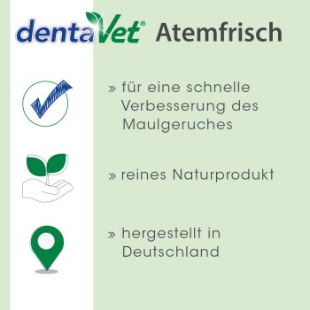 Geruchsbindung durch Chlorophyll, Pulver Kaum etwas kann die Mensch-Tier Beziehung so sehr stören, wie ein unangenehmer Maulgeruch. dentaVet Atemfrisch wurde genau für diese Problematik entwickelt. Eine der wohl hervorragenden Eigenschaften von Chlorophyll ist seine starke Fähigkeit der Geruchsbindung. Chlorophyll kann auch den Geruch läufiger Hündinnen deutlich reduzieren und somit Rüden fernhalten. Ebenso kann es bei starkem `Eigenduft´ des Hundes den Geruch erheblich verbessern. Expertentipp: dentaVet Atemfrisch kann seine positiven Eigenschaften noch effektiver entfalten, wenn es vor der Verfütterung mit heißem Wasser übergossen oder als Tee aufgesetzt wird.