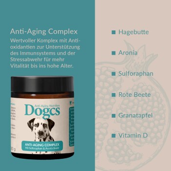 Hunde sind unsere treuen Begleiter und ein wertvoller Teil unseres täglichen Lebens. Deshalb wünschen wir uns, dass sie möglichst lange Zeit an unserer Seite bleiben. Stress kann unsere Hunde auf vielfältige Art und Weise belasten. Dies können offensichtliche Situationen sein wie Begegnungen mit anderen Hunden oder der Besuch beim Tierarzt. Aber auch Umweltverschmutzung und Lärmbelastung bereiten unseren Hunden nachhaltig Stress. Dieser Stress kann zu vorzeitigen Alterungserscheinungen führen. Deshalb ist es sinnvoll, unsere Hunde ausgewogen zu ernähren und sie gezielt mit Nährstoffen zu versorgen, die ihre Vitalität fördern und Alterungsprozesse verlangsamen. Dogcs Anti-Aging Complex leistet mit der einzigartigen Kombination aus Sulforaphan, Aronia Beeren, Orange, Curcuma, MSM und Vitamin D einen innovativen Beitrag zur Ernährung Ihres Hundes. Die hochwirksamen Antioxidantien unterstützen das Wohlbefinden und die Vitalität Ihres Hundes Tag für Tag. Dogcs Anti-Aging Complex ist sehr leicht anzuwenden: Es kann einfach dem gewohnten Futter des Hundes beigemischt werden und erfordert keine Fütterungsumstellung. Pflanzliches Leberwurstaroma macht es schmackhaft und die hohe Konzentration der Inhaltsstoffe sorgt dafür, dass eine kleine Menge einmal täglich ausreicht.