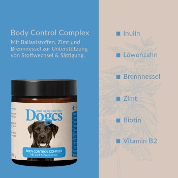 Übergewicht ist für Hunde genauso ungesund, wie für uns Menschen.Viele Hunde sind verrückt nach Essen und empfinden kein Sättigungsgefühl, was dazu führen kann, dass sie zu viel essen und schnell an Gewicht zunehmen. Besonders im Alter kann Übergewicht bei Hunden herausfordernd sein, da sich der Stoffwechsel verlangsamt und die körperliche Aktivität abnimmt. Ein zu hohes Gewicht kann zu Gelenkschmerzen, Diabetes, Herz-Kreislauf-Erkrankungen und Atemproblemen führen.Um das Risiko für Übergewicht zu reduzieren, ist es wichtig, eine ausgewogene Ernährung anzubieten und die Portionsgröße zu kontrollieren. Bei futterliebenden Hunden eignet sich eine ballaststoffreiche Kost, denn Ballaststoffe machen satt, regen den Darm an und regulieren des Stuhlvolumen. Es kann auch helfen die Fütterungsintervalle zu reduzieren und den Hund zu einer regelmäßigen körperlichen Aktivität zu ermutigen. Dogcs Body Control Complex ist ein hochwertiges Ergänzungsfuttermittel für Hunde, das eine ausgewogene Mischung aus Ballaststoffen, Zimt und Brennnessel enthält. Diese einzigartige Kombination kann die Sättigung und den Stoffwechsel Ihres Hundes auf natürliche Weise unterstützen. Eine ballaststoffreiche Ernährung bei Hunden kann für ein langanhaltendes Sättigungsgefühl sorgen, indem die Magenentleerung verzögert wird. Die natürlichen Aromen von Zimt und Brennnessel können bereits im Mundraum einen erhöhten Speichelfluss fördern und dadurch die Verdauung sanft unterstützen. Deshalb enthält unser Body Control Complex keine zusätzlichen Aromen, so können sich die wertvollen natürlichen Aromen von Zimt und Brennnessel voll entfalten. Dogcs Body Control Complex ist einfach anzuwenden, kann dem gewohnten Futter des Hundes beigemischt werden und erfordert keine Fütterungsumstellung. Eine kleine Menge ist bereits ausreichend, da die Inhaltsstoffe hochkonzentriert sind.