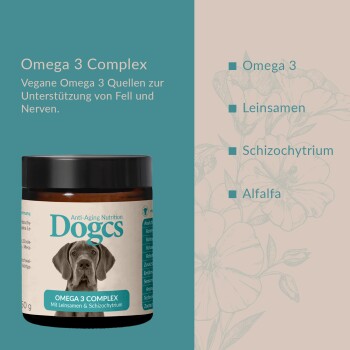 Ein glanzvolles, gepflegtes Fell ist auch bei Hunden ein Zeichen für Vitalität und Gesundheit. Die Beschaffenheit des Fells verrät viel über die Ernährung eines Hundes. Dogcs Omega 3 Complex ist ein hochwertiges Ergänzungsfuttermittel, das speziell entwickelt wurde, um den Körper Ihres Hundes mit lebenswichtigen Omega 3 Fettsäuren zu versorgen. Die vegane Formel enthält Omega 3 Fettsäuren aus Leinsamen, Alfalfa und Schizochytrium, eine Alge, die eine besonders reichhaltige Quelle für Docosahexaensäure (DHA) ist. Omega 3 Fettsäuren spielen eine wichtige Rolle für die kognitive Funktion Ihres Hundes, sie unterstützen seine Haut und sorgen von innen für ein dichtes und glänzendes Fell. Omega 3 Complex ist vegan und eignet sich daher auch für alle Hunde, die vegetarisch oder vegan ernährt werden. Die qualitativ hochwertigen Omega 3 Fettsäuren in Omega 3 Complex haben zudem eine besonders hohe Bioverfügbarkeit.Dogcs Omega 3 Complex ist sehr leicht anzuwenden: Es kann einfach dem gewohnten Futter des Hundes beigemischt werden und erfordert keine Fütterungsumstellung. Es bietet eine gute Alternative für Hunde, die Öle ungern fressen oder weniger gut vertragen. Durch das enthaltene pflanzliche Leberwurstaroma schmeckt der Dogcs Omega 3 Complex zart nach Leberwurst. Eine kleine Menge ist bereits ausreichend, da die Inhaltsstoffe hochkonzentriert sind.