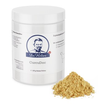 Dr. Hölter CurcuDoc Kurkuma für Hunde Kurkuma-Pulver zur Unterstützung von z.B. Verdauung und Gelenken von Hunden Für mehr Energie, Lebensfreude, Leistungsfähigkeit und Wohlbefinden Unterstützung für Abwehrkräfte und den Energiestoffwechsel getreidefrei, laktosefrei, sojafrei Zur Unterstützung Ihres Hundes Stärkung der Abwehrkräfte Förderung einer schnellen Erholung nach Operationen, Erkrankungen oder sportlicher Anstrengung begleitend bei Allergien und Darmerkrankungen bei erhöhtem oxidativen Stress (chronischen Entzündungen, starke körperliche Belastung, hohes Alter) Ein Curcuma-Extrakt speziell für Hunde Die einzigartige Kombination mit pflanzlichen Lecithin macht diesen Kurkuma-Extrakt 30 Mal besser bioverfügbar als herkömmliches Curcumin. Dies macht eine Kombination mit schwarzem Pfeffer (Piperin) unnötig. Qualität direkt vom Tierarzt Hergestellt in Deutschland als Kur oder zur lebenslangen Gabe geeignet schmackhaft und leicht zu dosieren getreidefrei, laktosefrei, sojafrei 100% Geschmacksgarantie in unserer Tierarztpraxis entwickelt und bewährt Bestandteile, die Dr. Hölter CurcuDoc so besonders machen Kurkuma-Extrakt (Curcumin) unterstützt die Darmgesundheit und den Leberstoffwechsel, schützt als natürliches Antioxidans die Körperzellen und Mitochondrien vor Schäden durch oxidativen Stress Beta-1,3/1,6-Glukane unterstützen die Abwehrkräfte Fütterungsempfehlung täglich 1 gestrichenen Messlöffel je 10 kg Körpergewicht zum Futter geben Ein Messlöffel befindet sich in der Packung. Eine genaue Fütterungsanleitung in Messlöffeln pro kg finden Sie auf der Packung Wenn möglich, teilen Sie die Tagesmenge CurcuDoc auf zwei Mahlzeiten auf (morgens und abends). Wasser zur freien Aufnahme anbieten. Bei Fragen helfen wir Ihnen gerne unter fressnapf@drhoelter.de .