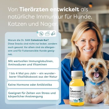 Wir verstehen die Bedeutung eines starken Immunsystems für dein Haustier. Unser Colostrum ist eine spezielle Nahrungsergänzung aus der entkaseinierten Erstmilch einer Kuh, gewonnen kurz nach der Geburt des Kalbes aus der 1. und 2. Überschuss-Melkung. Das Dr. SAM Colostrum ist reich an Nährstoffen, die besonders in stressigen Zeiten oder bei hoher körperlicher Beanspruchung deines Tieres von Nutzen sind. Zum Beispiel Aminosäuren für den Stoffwechsel und die Zellregeneration, Immunglobuline zur Bekämpfung von Infektionen durch phatogene Substanzen, Vitamine für die allgemeine Gesundheit, Lactoferrin zur Unterstützung der Immunabwehr und prolinreiche Polypeptide für ein starkes Immunsystem. Diese Kombination hilft, dein Tier vital und gesund zu halten. Indem du Colostrum wählst, bietest du deinem Haustier eine natürliche Unterstützung, die es in jeder Lebensphase stark und gesund hält. Es ist ideal für Hunde, Katzen und Nager, um ihr Wohlbefinden zu maximieren.
