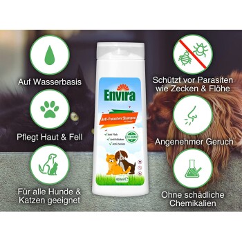 Envira Anti-Parasiten Shampoo für Hunde & Katzen, 2X 400 ml - Katzen- & Hundeshampoo gegen Zecken, Flöhe, Mücken, Juckreiz - Flohshampoo gegen Hundeflöhe.The product contains geraniol, may cause an allergic reaction