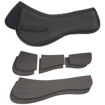 Das 3 Zonen Korrekturpad Vario bietet auf jeder Seite jeweils 2 große und 3 kleine Einschubtaschen für die im Lieferumfang enthaltenden Memory Foam Einlagen. Dies ermöglicht kleine Unterschiede in der Muskulatur des Pferdes individuell auszugleichen. Dadurch ist es auch für Pferde geeignet deren Muskulatur nicht geleichmäßig ausgebildet ist, oder während längerer Trainingspausen Muskulatur abgebaut haben. Es eignet sich zudem auch zum Ausgleich von Unregelmäßigkeiten des Körperbaus sowie zur Korrektur der Sattellage. Das Einsetzen und Herausnehmen der Einlagen ist dank Klettverschluss problemlos möglich. Die Memory Foam Einlagen sind so konstruiert, dass sie gezielt in 7 separaten Einschubtaschen positioniert werden können. Dank der besonderen Materialeigenschaften wird ein optimaler Polstereffekt ohne zu federn garantiert. Die anatomisch angepasste Form des Sattelkissens sorgt für einen scheuerfreien Einsatz und wirkt dank der Auflagefläche aus Neopren besonders rutschhemmend und schockabsorbierend. Größe S: - Rückenlänge: ca. 52cm Größe M: - Rückenlänge: ca. 57cm - ermöglicht einen individuellen Ausgleich der Sattelauflagefläche - 8 Einschubtaschen - 2 große Memory Foam Einlagen (10mm Stärke pro Einlage) - 6 kleine Memory Foam Einlagen (10mm Stärke pro Einlage) - verstellbare Klettverschlüsse