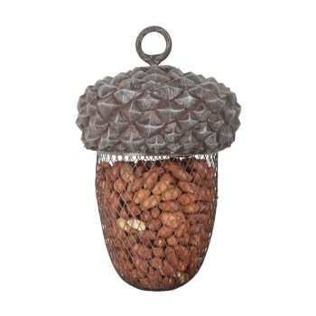 Verfüttern Sie auch gerne Erdnüsse als nahrhaftes Vogelfutter an die Wildvögel in Ihrem Garten? Dann bekommen Sie mit der Esschert Futterstelle Eichel jetzt einen besonders dekorativen Futterspender dafür. Diese formschöne Vogelfutterstation ist schon ein Hingucker, wenn sie auf dem Balkon oder vor dem Fenster hängt. Aus einer Polyresinhaube und Metall wurde eine Eichel in hochwertiger Qualität nachgebildet, täuschend echt, aber mit 14x14x22 cm natürlich in Übergröße. Selbstverständlich können Sie in dieses schmucke Futterkörbchen neben Erdnüssen, auch Walnüsse oder Haselnüsse einfüllen, die den Vögeln in Ihrer Umgebung schmecken. Dazu lösen Sie einfach die Aufhängeöse vom Futterspender, nehmen den Deckel ab und geben das leckere und nahrhafte Futter hinein. Dank des praktischen Aufhängeringeskönnen Sie die Esschert Futterstelle Eichel überall dort befestigen, wo Sie möchten, egal ob auf dem Balkon, vor dem Küchenfenster oder an einem Baum in Ihrem Garten. Da werden die Vögel in Ihrem Garten aber stauen, wenn sie ihren neuen Futterplatz zum ersten Mal anfliegen - eine willkommene Abwechlung zu den herkömmlichen Futterhäusern!