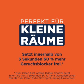 Ever Clean Fast Acting Odour Control ist eine Klumpstreu mit einer Formel aus verschiedenen Pflanzenextrakten, die Gerüche schnell isoliert und beseitigt: Innerhalb von 3 Sekunden 60 % werden mehr Geruchsblocker freigesetzt*, sodass die Streu ideal für die Bekämpfung von Urin-, Kot- und Ammoniakgerüchen in kleinen Räumen ist. Unsere Aktivkohle-Technologie bindet und beseitigt schlechte Gerüche, statt sie nur zu überdecken. Die durch Pfotendruck aktivierte Dufttechnologie setzt einen frischen Duft frei, wenn die Katzentoilette genutzt wird, und sorgt für langanhaltende Frische. *Ever Clean Fast Acting Odour Control setzt innerhalb von 3 Sekunden 60 % mehr Geruchsblocker frei als Ever Clean Extra Strong Clumping Scented. Die Verpackung ist zu 100 % recycelbar.
