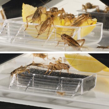 Grillen bevorzugen dunkle Plätze und kriechen daher gerne in die Röhrchen, die ihnen als Versteck dienen. Die Röhrchen können so einfach als Füttergeräte verwendet werden. Wenn die Abdeckung entfernt wurde, bleiben die Röhrchen in Position. Dies ermöglicht einen einfachen Zugang und verringert das Risiko, dass die Grillen entwischen.