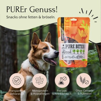 Probierpaket "Snack it" Dein Hund verdient nur die besten Snacks, die nicht nur mit einem unglaublich leckeren Geschmack, sondern auch mit reinen, natürlichen Zutaten überzeugen. Unser sorgfältig zusammengestelltes Set besteht aus 6 köstlichen Leckerlisorten. Es ist nicht nur perfekt, um die unterschiedlichen Geschmacksrichtungen zu testen, sondern eignet sich auch hervorragend, um den Vorrat an gesunden und verträglichen Leckerlis aufzustocken. So wird jeder Snack-Moment für Deinen Hund zu einem besonderen Highlight. Alle Produkte sind mit einem Durchmesser von ca. 1 cm ideal für das Training mit Deinem Doggo. Die wichtigsten Vorteile auf einen Blick: Natürlich lecker: Ob knusprig-crunchy oder herrlich soft, diese Snacks sind nicht nur unglaublich lecker, sondern auch von höchster Qualität. Hergestellt in kleinen deutschen Manufakturbetrieben, legen wir höchsten Wert auf natürliche Zutaten und verzichten bewusst auf Getreide und jegliche Zusatzstoffe wie künstliche Aromen oder Konservierungsmittel. Frisches Fleisch: Jede Sorte in diesem Set besteht aus hochwertigen, natürlichen Zutaten, die sorgfältig ausgewählt und schonend verarbeitet werden. Von frischem Fleisch über knackiges Obst und Gemüse bis hin zu aromatischen Kräutern – jeder Inhaltsstoff wird mit Bedacht gewählt, um Deinem Hund das Beste aus der Natur zu bieten. Transparente Deklaration: Wir setzen auf klare, transparente Rezepturen, damit Du genau weißt, was in den Snacks steckt. Dadurch sind unsere Leckerlis nicht nur besonders gut verträglich, sondern auch für sensible Hunde bestens geeignet. Und Du kannst Deinen Liebling ohne Bedenken verwöhnen. Gönne Deinem vierbeinigen Freund die Liebe und Qualität, die er verdient, und entdecke gemeinsam mit ihm die Vielfalt unserer liebevoll hergestellten Snacks. Denn Glück beginnt mit einem Schwanzwedeln – und das kommt mit jedem Bissen ein bisschen mehr! Inhalt: 1x Nature Cookies – Wild (120g) 1x PURE Bites - Rind (120g) 1x PURE Bites - Ente (120g) 1x PURE Bites – Lamm (120g) 1x PURE Bites – Hirsch (120g) 1x PURE Bites – Veggie (120g)