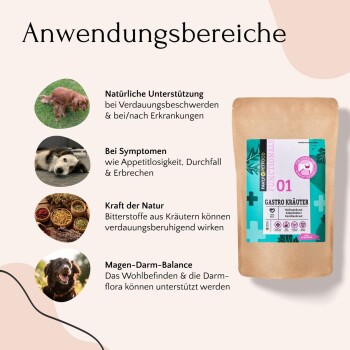GASTRO Kräutermischung - Zur natürlichen Unterstützung einer geregelten Verdauung und Stabilisierung der Darmflora . Umwelteinflüsse, Medikamentengabe, Stress oder ein Parasitenbefall führen bei den meisten Hunden zu Verdauungsbeschwerden . Die sichtbaren Symptome sind vielfältig und reichen u.a. von Appetitlosigkeit über Erbrechen bis hin zu Durchfall . Ein gereizter Magen und eine gestörte Darmflora können sich außerdem negativ auf das Wohlbefinden auswirken. Unsere GASTRO Kräutermischung unterstützt durch ihre natürliche Wirkstoffkombination bei akuten Beschwerden wie Durchfall, Blähungen und einer gestörten Darm- flora . Die speziell aufeinander abgestimmten Kräuter können die Darmflora stabilisieren und die Verdauungssäfte anregen. Das Wohlbefinden Deines Hundes wird unterstützt und das natürliche Gleichgewicht im Hundekörper kann wieder hergestellt werden . Auch symptomfreie Hunde profitieren von einer vorbeugenden Fütterung.