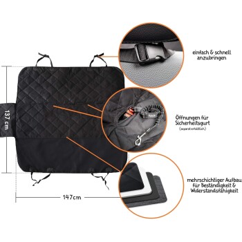 Floxik Premium Autoschondecke mit SeitenschutzDie Schutzdecke von Hundeliebhabern für Hundeliebhaber!Nimmst Du Dein Haustier gerne im Auto mit? Hast aber keine Lust Dir Sorgen um Schmutz, Haare und Kratzer auf Deinen Sitzen zu machen? Dann ist die Floxik Schondecke die perfekte Lösung für Dein Problem! Viele Schondecken reißen leicht, passen nicht ins Auto oder sind einfach zu kompliziert - deswegen haben wir die Floxik Autoschondecke entwickelt. Unsere Schondecke ist reißfest, wasserabweisend, rutschfest & zugleich bequem! Der Seitenschutz schützt zudem die Innentüren vor Schmutz und Kratzern.137 x 147 cm Größe, geeignet für alle gängigen AutomodelleInklusive Seitenschutz für noch mehr KomfortEinfacher Einbau und Ausbau in unter 2 Minuten dank KlickverschlüssenGroßflächige Anti-Rutsch Beschichtung für einen sicheren HaltMit 2 Öffnungen für Sicherheitsgurte, damit Dein Hund sicher reistGanz einfach zu reinigen dank schmutzresistenter, wasserabweisender MaterialoberflächeSchnell zu falten und zu verstauenLieferumfang: Schondecke, praktische Tasche & Spielzeug