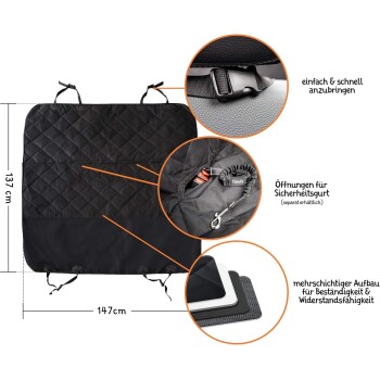 Floxik Premium AutoschondeckeDie Schutzdecke von Hundeliebhabern für Hundeliebhaber!Nimmst Du Dein Haustier gerne im Auto mit? Hast aber keine Lust Dir Sorgen um Schmutz, Haare und Kratzer auf Deinen Sitzen zu machen? Dann ist die Floxik Schondecke die perfekte Lösung für Dein Problem! Dürfen wir vorstellen: Floxik! Viele Schondecken reißen leicht, passen nicht ins Auto oder sind einfach zu kompliziert - deswegen haben wir die Floxik Autoschondecke entwickelt. Unsere Schondecke ist reißfest, wasserabweisend, rutschfest und zugleich bequem!137 x 147 cm Größe, geeignet für alle gängigen AutomodelleEinfacher Einbau und Ausbau in unter 2 Minuten dank KlickverschlüssenGroßflächige Anti-Rutsch Beschichtung für einen sicheren HaltMit 2 Öffnungen für Sicherheitsgurte, damit Dein Hund sicher reistGanz einfach zu reinigen dank schmutzresistenter, wasserabweisender MaterialoberflächeSchnell zu falten und zu verstauenLieferumfang: Schondecke, praktische Tasche & Spielzeug