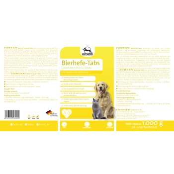 FORTAN® Bierhefe-Tabs bestehen zu 100% aus echter Bierhefe (Saccharomyces cerevisiae). Die verwendete inaktivierte Bierhefe stammt ausschließlich aus Brauereien, die ihr Bier nach dem deutschen Reinheitsgebot aus dem Jahr 1516 brauen. Dies ist deshalb besonders bedeutsam, da nur echte Bierhefe die Polyphenole (Alpha- und Beta-Säuren) des Hopfens enthält, der während des Brauprozesses zugegeben wird. Neben den seit langem bekannten Wirkungen von Bierhefe bewirken die Inhaltsstoffe des Hopfens, die nur in der echten Bierhefe vorkommen, antioxidative, adstringierende und bakteriostatische Effekte. Auf Grund ihrer Zusammensetzung kann durch die regelmäßige Gabe von FORTAN® Bierhefe-Tabs die Qualität von Futtermischungen, ob Fertigfutter oder selbst zubereiteter Rationen (z. B. BARF), auf natürliche und gesunde Art und Weise nachhaltig optimiert werden. Zudem unterstützt der hohe Gehalt an Nukleotiden, Aminosäuren, B-Vitaminen und Spurenelementen die Zucht, das Wachstum und vor allem das äußere Erscheinungsbild von Hund und Katze.