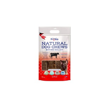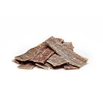friGERA Rinderschlundfleisch - die beste Art, Ihren geliebten Hund zu verwöhnen!Unsere Rinderschlundfleisch ist ein schmackhafter Snack aus zart getrockneter Naturschleimhaut von Rindern aus Freilandhaltung, die für Fleisch in Menschenqualität verwendet werden. Diese Tiere werden ohne den Zusatz von Antibiotika, Steroiden oder Hormonen aufgezogen - natürlicher geht es kaum noch! Dieser Snacks ist reich an Eiweiß, Eisen, Zink, Magnesium und Vitamin B12, aber fettarm, was zu einer gesunden Muskulatur beiträgt und Ihren Hund mit wichtigen Komponenten versorgt. Da unser Schlund vorgeschnitten und daher leicht zu portionieren ist, ist er für alle Hundegrößen geeignet. Selbst Welpen können diese absolute Delikatesse genießen!Dieses feine, zarte, magere Fleisch könnte man ohne weiteres als das "Filet" unter den Hundeleckerlis bezeichnen!