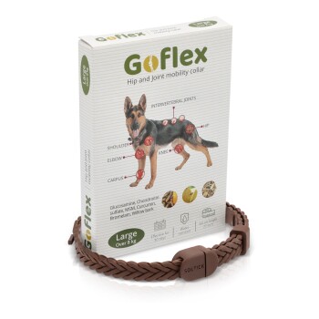 Das Goflex Hüft- und Gelenk-Bewegungshalsband ist eine neuartige, patentierte Control Freigabe-Technologie. Das Halsband fungiert als Behälter für die Wirkstoffe und gewährleistet durch den Kontakt mit dem Körper des Tieres eine konstante Dosierung über einen Zeitraum von 30 Tagen. Das Hüft- und Gelenkhalsband enthält eine leistungsstarke Mischung aus Glucasamin, Chondroitinsulfat, MSM, Curcumin, Weidenrinde und Bromelain. Das Goflex Halsband liefert die Inhaltsstoffe, die langsam freigesetzt und absorbiert werden, um die Gelenke 24/7 zu unterstützen. Einer von fünf Hunden hat Gelenkprobleme im Laufe seines Lebens, was zu Schmerzen und möglichen Mobilitätsproblemen führt. Das Halsband besteht aus Polyethylen und ist wasserbeständig. Es bietet eine lang anhaltende Wirkung - bis zu 30 Tage wirksam. Erhältlich in verschiedenen Größen: Kleine Hunde (Halsband Länge 39 cm) - bis 8 kg Körpergewicht Große Hunde (Halsband Länge 69 cm) - ab 8 kg Körpergewicht Wofür ist GoFlex nützlich? Die Gelenke werden durch den Gelenkknorpel geschützt, der als Stoßdämpfer fungiert. Bei Gelenkbeschwerden funktioniert dieser Knorpel nicht mehr richtig und schützt die Gelenke weniger effektiv, was zu Steifheit, Schmerzen und eingeschränkter Beweglichkeit führt. GoFlex Collar enthält eine wirksame Kombination aus Glucosamin/Chondroitin Sulfat und MSM, die im Körper des Tieres natürlich vorkommen und wichtig sind für die Erhaltung gesunder Gelenke. Glucosamin/Chondroitinsulfat sind das am häufigsten verwendete Ergänzungsmittel bei Osteoarthritis-Fällen Eine Studie zeigt, dass Goflex Collar wirksam ist für: Linderung von Gelenkbeschwerden & Steifheit Arthritis Rheumatoide Arithritis Schmerzlinderung Gelenkentzündung Muskelkater
