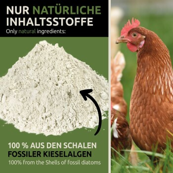 TrockenstreupulverKieselgur ist ein Produkt natürlichen Ursprungs und besteht aus den fossilen Schalen abgestorbener Kieselalgen. Es ist bekannt dafür, dass es Feuchtigkeit aufnehmen und auch speichern kann, was sich ideal für die Verbesserung des Stallklimas eignet. Die Ausbringung kann im Stall, Garten oder Haus stattfinden, solange für ausreichend Belüftung gesorgt wird. Da die Qualität von Eiern und Fleisch nicht durch die Anwendung beeinträchtigt wird, eignet sich GreenPet KiesoVet® auch für Bio-Betriebe. Das Produkt ist sowohl für die Trocken- als auch Flüssigausbringung geeignet.