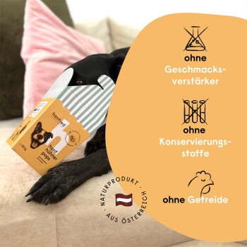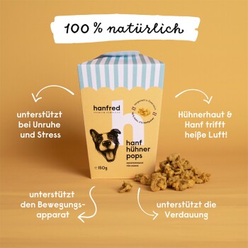 Entdecke den perfekten Snack für deinen vierbeinigen Freund - ob groß oder klein! Die einzigartigen "hanfred Hühner Pops" werden sorgfältig aus Hühnerhaut, Hanf und heißer Luft hergestellt, und das alles OHNE jegliche weiteren Zusätze. Der in Österreich angebaute Hanf von hanfred ist nicht nur besonders hochwertig, sondern unterstützt auch den Bewegungsapparat deines Hundes und trägt dazu bei, Stress zu minimieren.Gönn deinem Hund eine köstliche Auszeit mit unseren knusprigen Leckerbissen. Egal, ob als Belohnung oder einfach zwischendurch - die Hanf-Hühner-Pops sind nicht nur schmackhaft, sondern auch eine natürliche Ergänzung für das Wohlbefinden deines Hundes. Ohne Geschmacksverstärker Ohne Konservierungsstoffe Single Protein Ohne Getreide Schutz vor Stress Unterstützt das Immunsystem Natürliche Zutaten