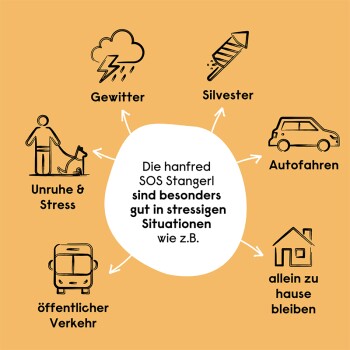Das hanfred SOS Sortiment ist perfekt für stressige Situationen. Außerdem unterstützt es die Gelenke und den Darm auf ganz natürliche Weise! - Snack mit Mehrwert gegen Unruhe & Stress - schnell und ganz natürlich- Snack mit mit Mehrwert für die Gelenke - unterstützt den Bewegungsapparat- Snack mit Mehrwert für Senior Dogs und deren Alterserscheinungen - wieder fit & mobil. Ohne Geschmacksverstärker Ohne Konservierungsstoffe Ohne Getreide Natürliche Zutaten Made in Austria, eigener Hanfanbau und händische Verarbeitung