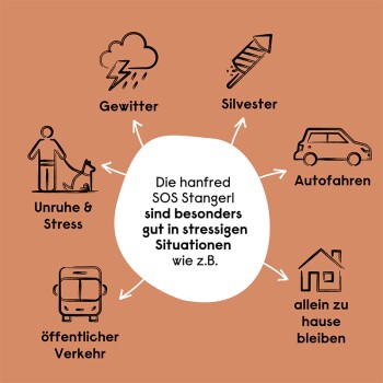Das hanfred SOS Sortiment ist perfekt für stressige Situationen. Außerdem unterstützt es die Gelenke und den Darm auf ganz natürliche Weise! - Snack mit Mehrwert gegen Unruhe & Stress - schnell und ganz natürlich- Snack mit mit Mehrwert für die Gelenke - unterstützt den Bewegungsapparat- Snack mit Mehrwert für Senior Dogs und deren Alterserscheinungen - wieder fit & mobil. Ohne Geschmacksverstärker Ohne Konservierungsstoffe Ohne Getreide Natürliche Zutaten Made in Austria, eigener Hanfanbau und händische Verarbeitung